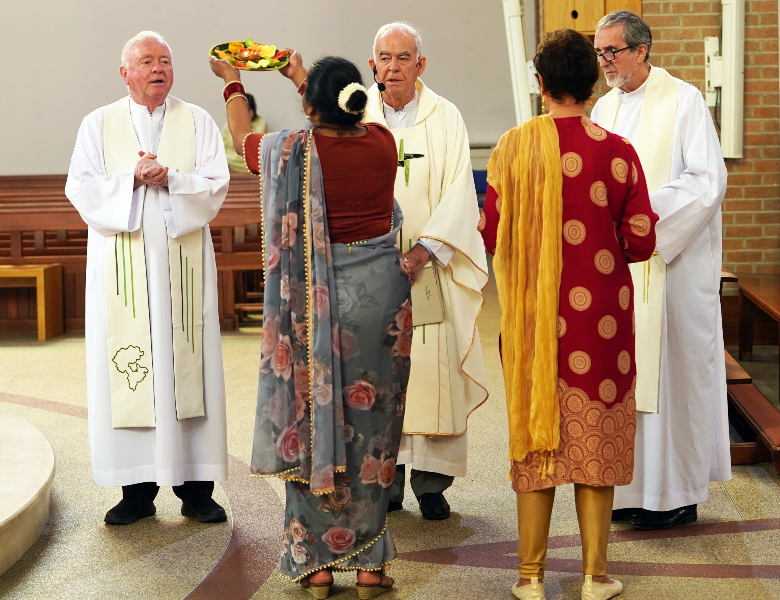 One of them, Sr Anne Lata, organised an Indian welcome ritual as the entrance procession arrived at the sanctuary. She garlanded me with flowers, put a spot of sandalwood paste on my forehead and then waved a brass tray with a lighted Indian oil lamp three times in front of me (aarti). The garland indicated respectful welcome, the aarti was a sign of blessing and the sandalwood paste symbolised a calm pure focus by the third eye of spiritual insight.
